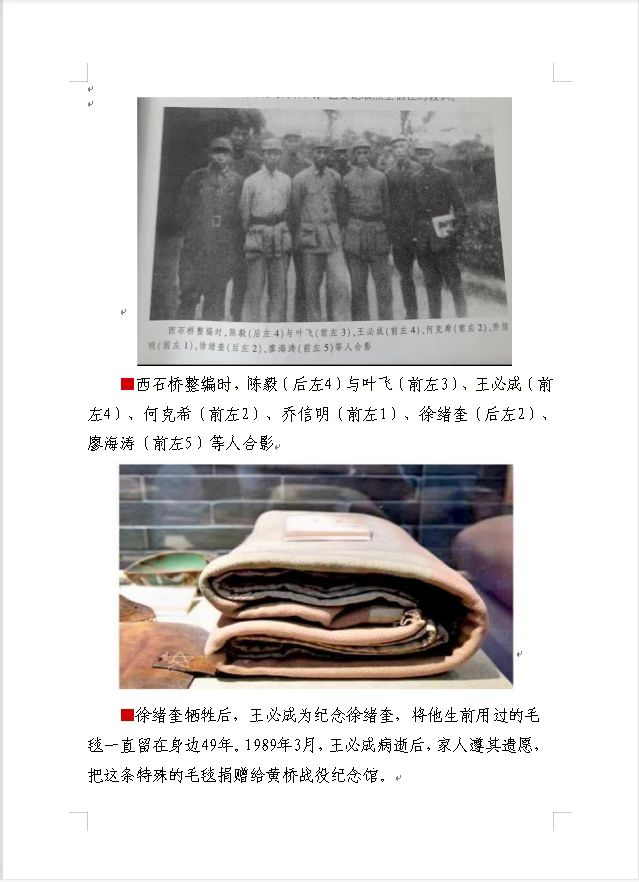 遗物(一条旧毛毯):遗物一条缴获的旧毛毯,由战友王必成将军珍藏了49年。1989年,王将军夫人陈瑛遵嘱将其捐赠给新四军黄桥战役纪念馆,该毛毯1995年被评定为国家二级文物。